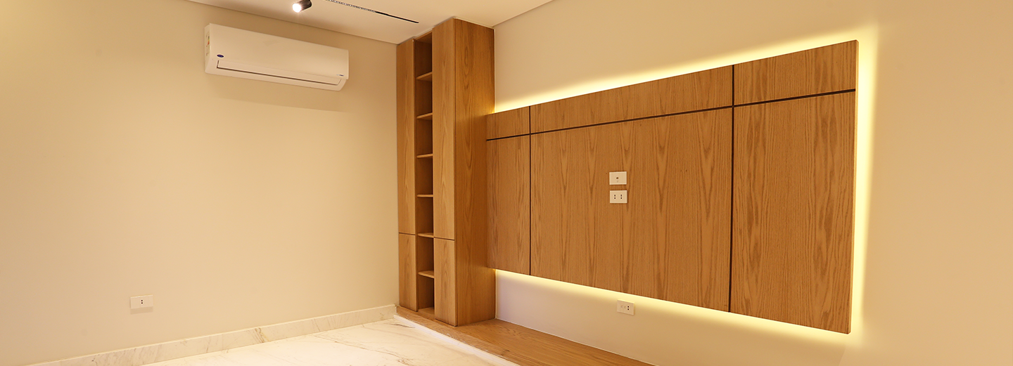 he project involved designing and executing a 140-square-meter residential apartment to reflect the client’s vision of uniqueness and elegance. The scope covered space planning for reception, living, bedrooms, bathrooms, and kitchen, along with integrating refined finishes such as open-book marble flooring and a concealed air-conditioning system in the master suite, ensuring both functionality and sophistication.